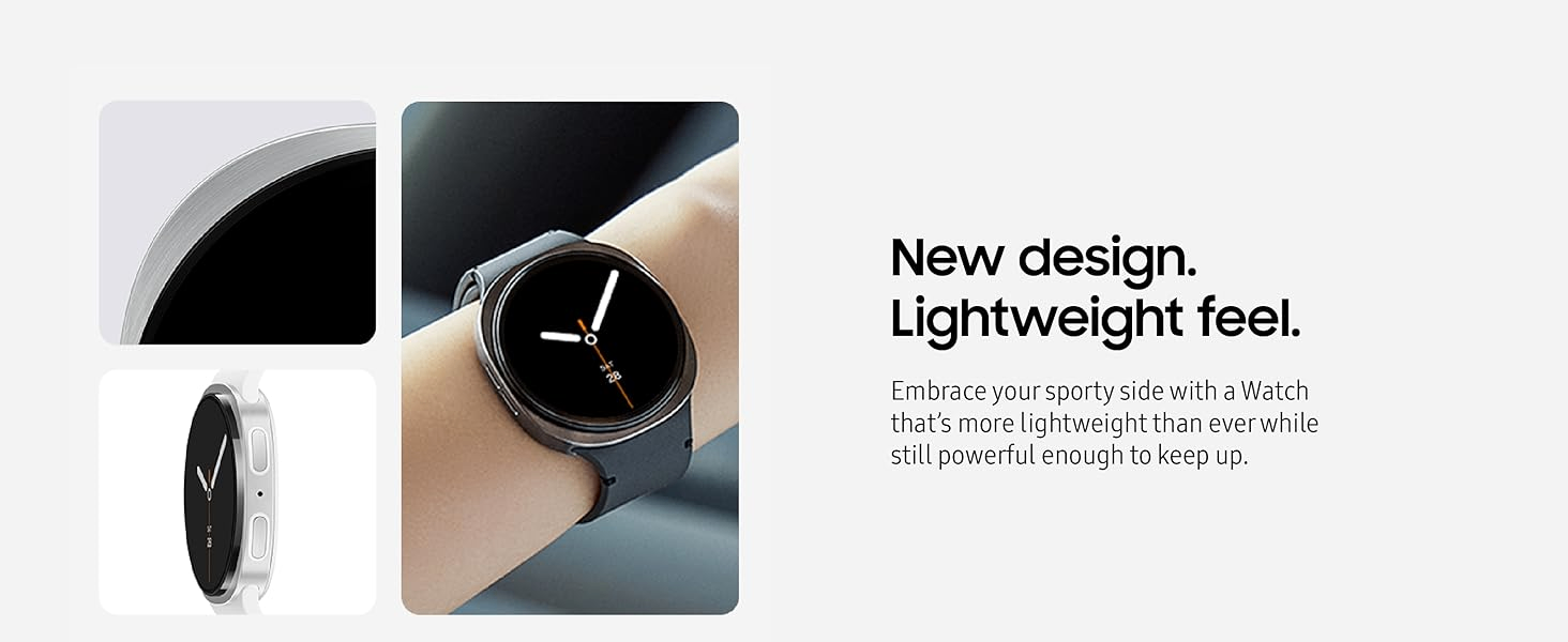 NEW DESIGN. LIGHTWEIGHT FEEL: Maximize your days with a minimalist design. The sleek, thinner-than-ever silhouette makes Galaxy Watch8 look as good as it functions. With a snug fit and sporty style, it gives you readings without getting in your way.